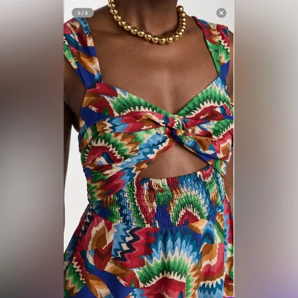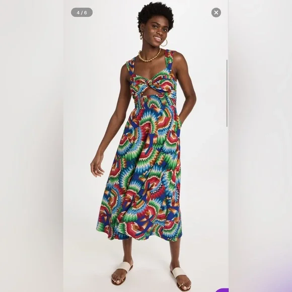 Stunning midi dress with a vibrant multicolor pattern. Features a unique cut-out design.With an elaborate chevron pattern, a fit-and-flare drape, and a twist at the bodice, this FARM Rio midi dress cuts a distinct silhouette. Complete your outfit with a favorite pair of heeled sandals.* Fabric: Lightweight, non-stretch linen weave* Smocked elastic waistband and back* Twist sweetheart neckline* Pockets* Pleated shoulder straps* Embroidered hem* Hook-and-eye and hidden zip at back* On-seam hip pockets* Shell: 55% linen/45% viscose* Unlined* Wash cold