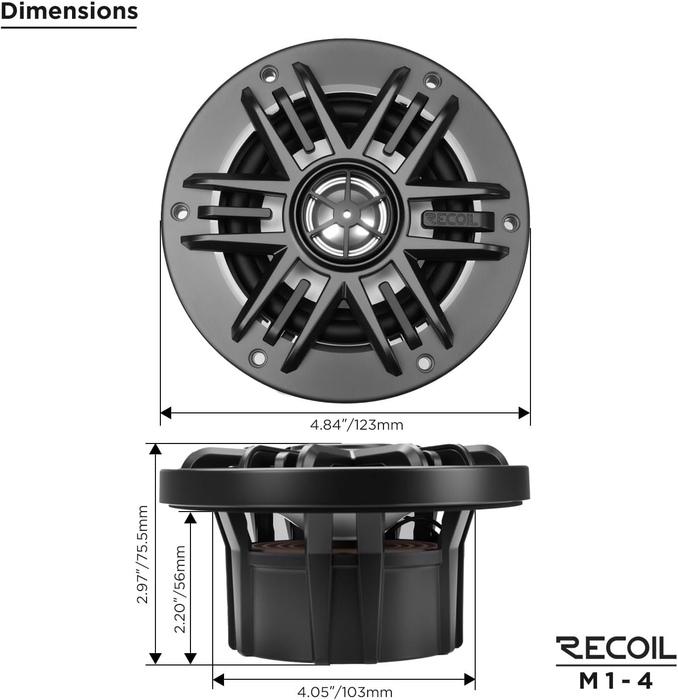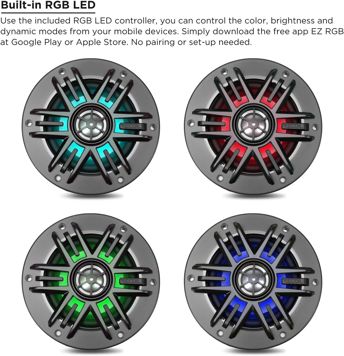 Recoil M1-4 M1 Series 4 Inch 2-Way Marine Boat & UTV/ATV Coaxial Speakers with Built-in RGB LED Lighting, Include RGB LED Controller, One Pair of Each Silver Gray & White Grilles, 4Ohm, MAX POWER 160W Pair