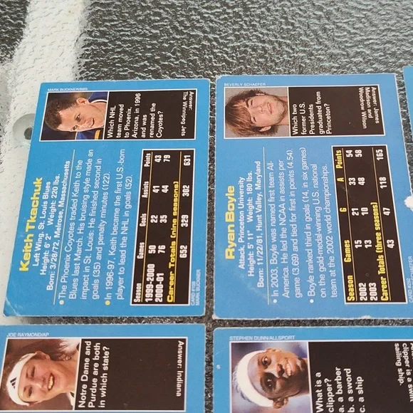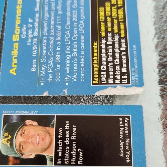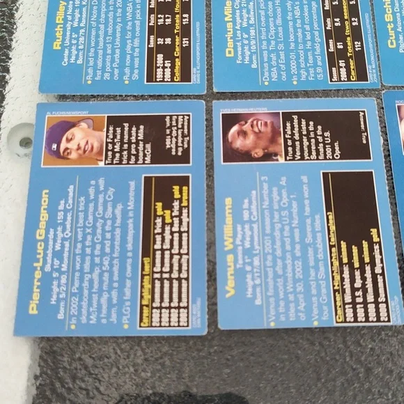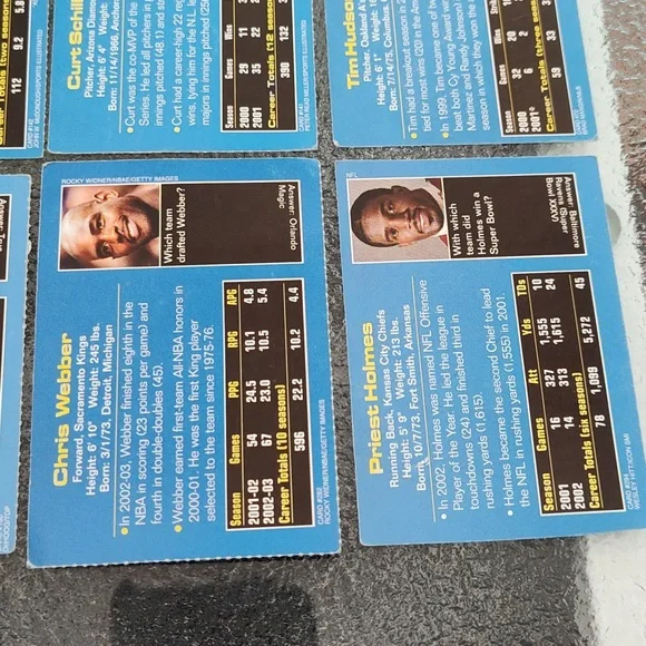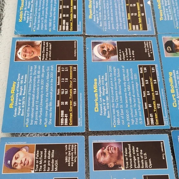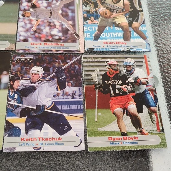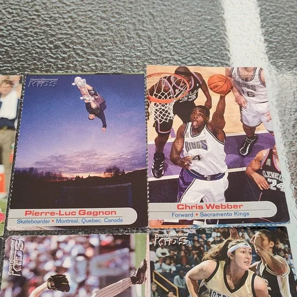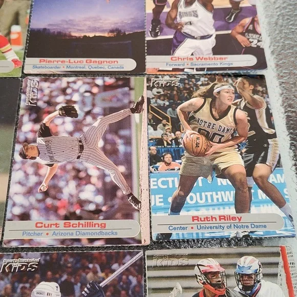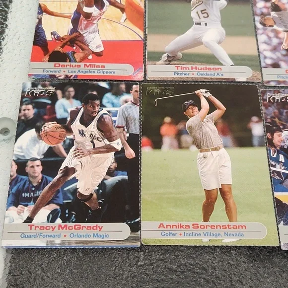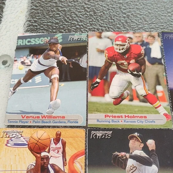 Bag #18Venus Williams - TennisPriest Holmes - Football - Kansas City Chiefs - NFLPierre-Luc Gagnon - Skateboarder Chris Weber - Basketball - Sacramento Kings - NBA Darius Miles - Basketball - Los Angeles Clippers - NBATim Hudson - Baseball - Oakland A's - MLBCurt Schilling - Baseball - Arizona Diamondbacks - MLBRuth Riley - College Basketball - University of Notre DameTracy McGrady - Basketball - Orlando Magic - NBAAnnika Sorenstam - GolferKeith Tkachuk - Hockey - St. Louis Blues - NHLRyan Boyle - College Lacrosse - PrincetonSports Illustrated Kids Trading Cards - Set of 12 - GUCA dozen trading cards in good, used condition!Please check photos carefully before purchasing. Athletes listed above and photographed are the cards you will be receiving. Packs are for sale as is. These are great for the collector or sports enthusiast in your life! *Ships from NY! Pet-free, smoke-free home! Will consider reasonable offers! *Comment with any questions! Please ask all questions prior to purchasing. ALL SALES ARE FINAL. Please read this listing carefully and check the photos. I want you to love your purchase! 3/24Drawer #3