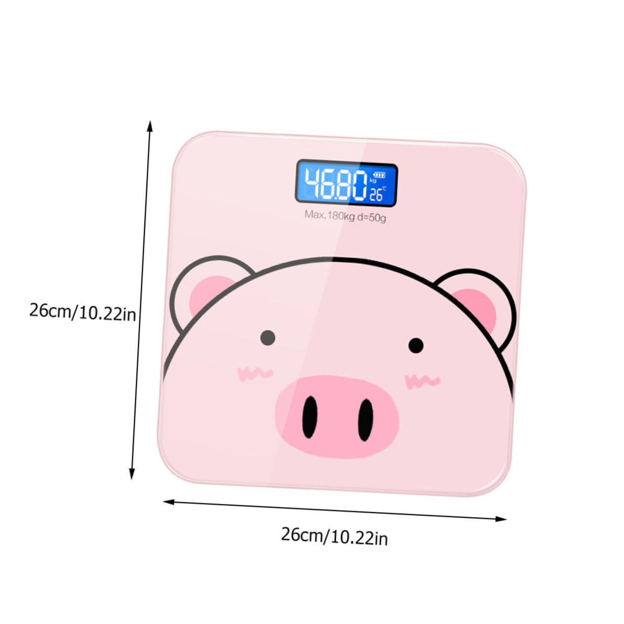 Package List 1 x body weight scale Features - Material: Tempered Glass scale for body weight rechargeable. - Color: Pink accurate weight scale. -Product Info:Electronic weight scale - Size: About 26.00X26.00X2.50cm/10.22X10.22X0.98inch digital body weight scale. - Charging method: battery/USB charging highly accurate body weight. - Display mode: LCD high-definition night vision electronic weight scale for people. - Load-bearing range: 0.2-180kg home scale for body weight. - Weighing unit: kilogram or single catty weight scales for people. - Display accuracy: 2 decimal places weight scale digital. - High-sensitivity sensor, battery and room temperature can be displayed, innovative design, just for a better life! weighing scale for body weight - Switchable between kilograms per catty, LCD high-definition display cute body weight scale. - tempered glass, cartoon and cute, USB port can be charged, convenient and easy to use accurate body weight scale. - The weighing range is 0.2-180kg, accurate to two decimal places, to meet various weighing needs digital body scale. - Intelligent sensor , the can be measured, and the lower scale will automatically shut down in 8 seconds weight scale.Goods Descriptiondigital body weight scale This electronic body weight scale can quickly and easily measure weight.cute body weight scale Made with premium tempered glass material, with strong load bearing.electronic scale An accurate measurement, you can also pay attention to weight changes at any time! Very practical and durable